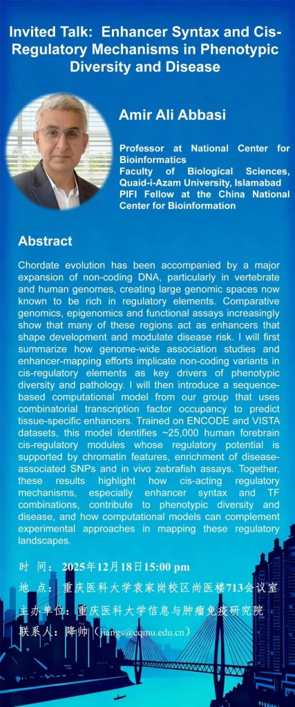 Prof. Dr. Amir Ali Abbasi delivered an invited scientific talk at Chongqing Medical University, China in December 2025. The purpose of his talk was to highlight the role of enhancer function in the pathogenesis of human diseases.